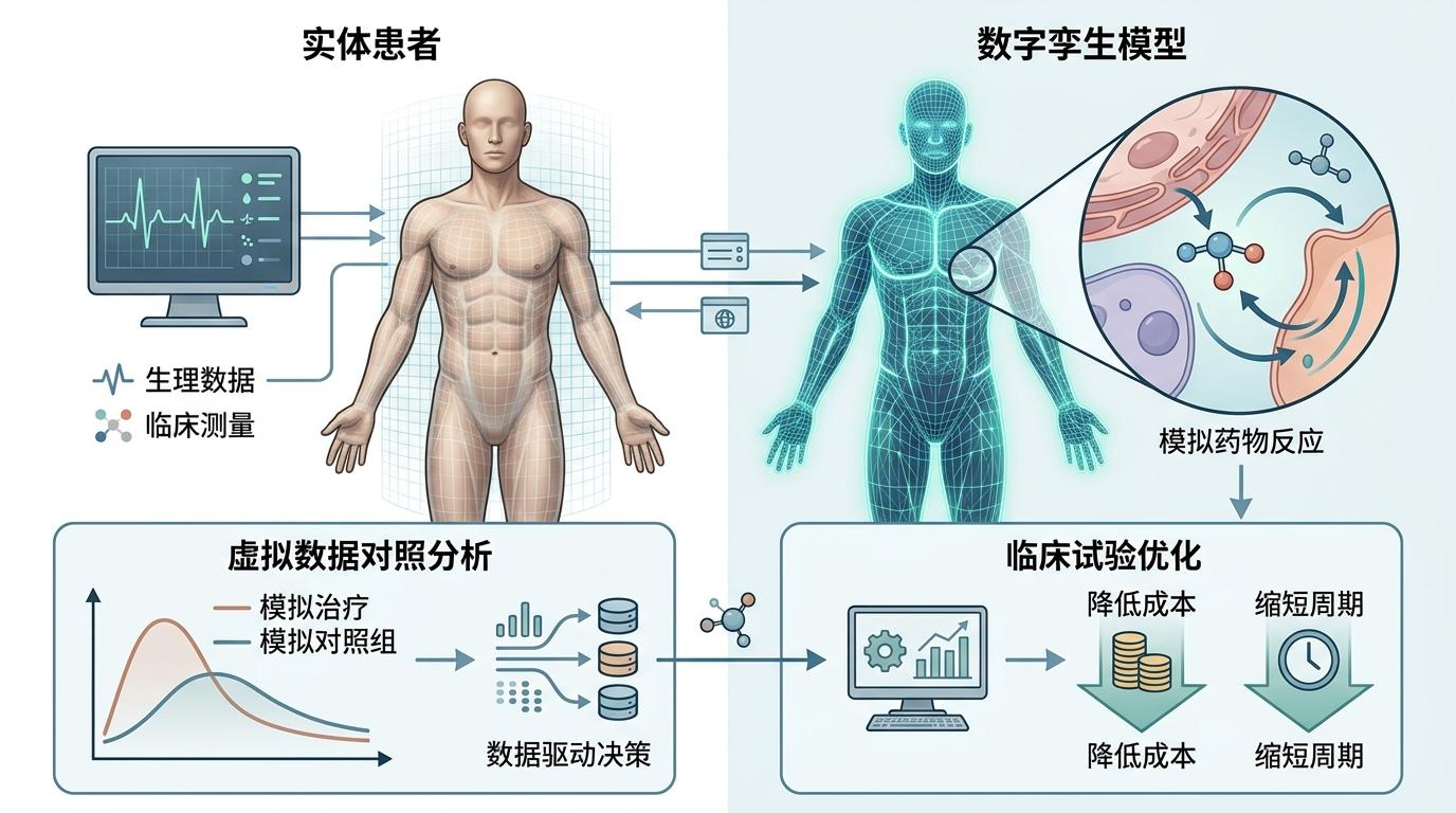 还有更激进的尝试:数字孪生技术。它能给每个患者建一个虚拟模型,模拟他们对药物的反应,甚至生成「合成对照组」——不用再找大量健康人参与试验,靠虚拟数据就能完成对照分析。这不仅能降低伦理争议,还能把临床试验的成本降低40%,周期缩短30%到50%。