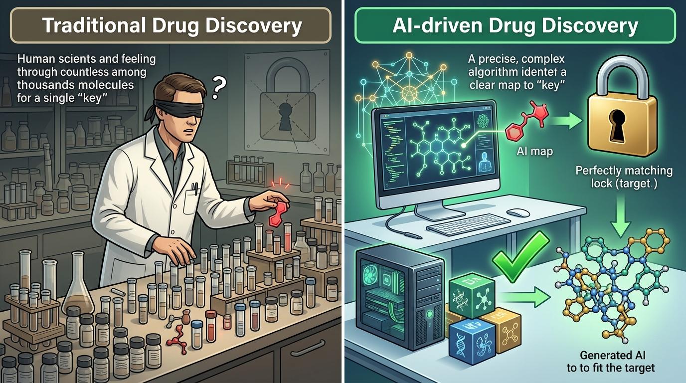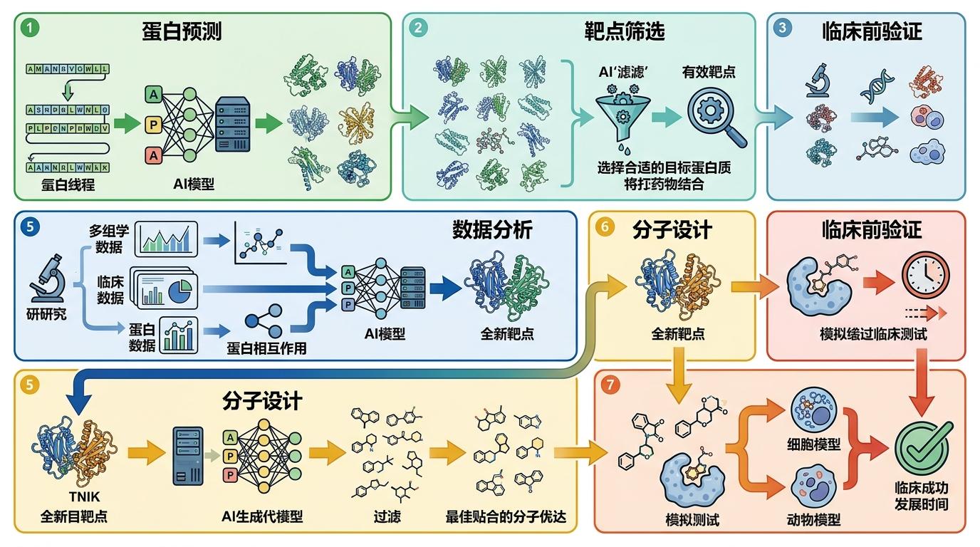 你可以把传统药物研发比作蒙着眼睛找钥匙:在数百万个化合物里逐个试错,靠反复实验碰运气找到能和疾病靶点结合的分子。而AI做的,是给你一张精准的地图——通过分析基因组、蛋白质组、临床数据等海量信息,直接定位最有潜力的靶点,甚至从零生成符合要求的分子结构。