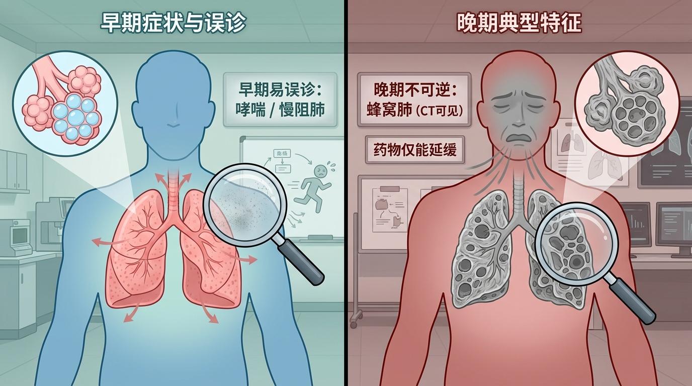 更隐蔽的是,它的早期症状太像普通呼吸道问题:干咳、活动后气短、容易疲劳,70%的患者初期会被误诊为哮喘或慢阻肺。等出现明显的呼吸困难,CT上已经能看到典型的“蜂窝肺”——这意味着至少一半的肺组织已经被纤维组织取代,连现有药物都只能延缓进展,无法逆转。