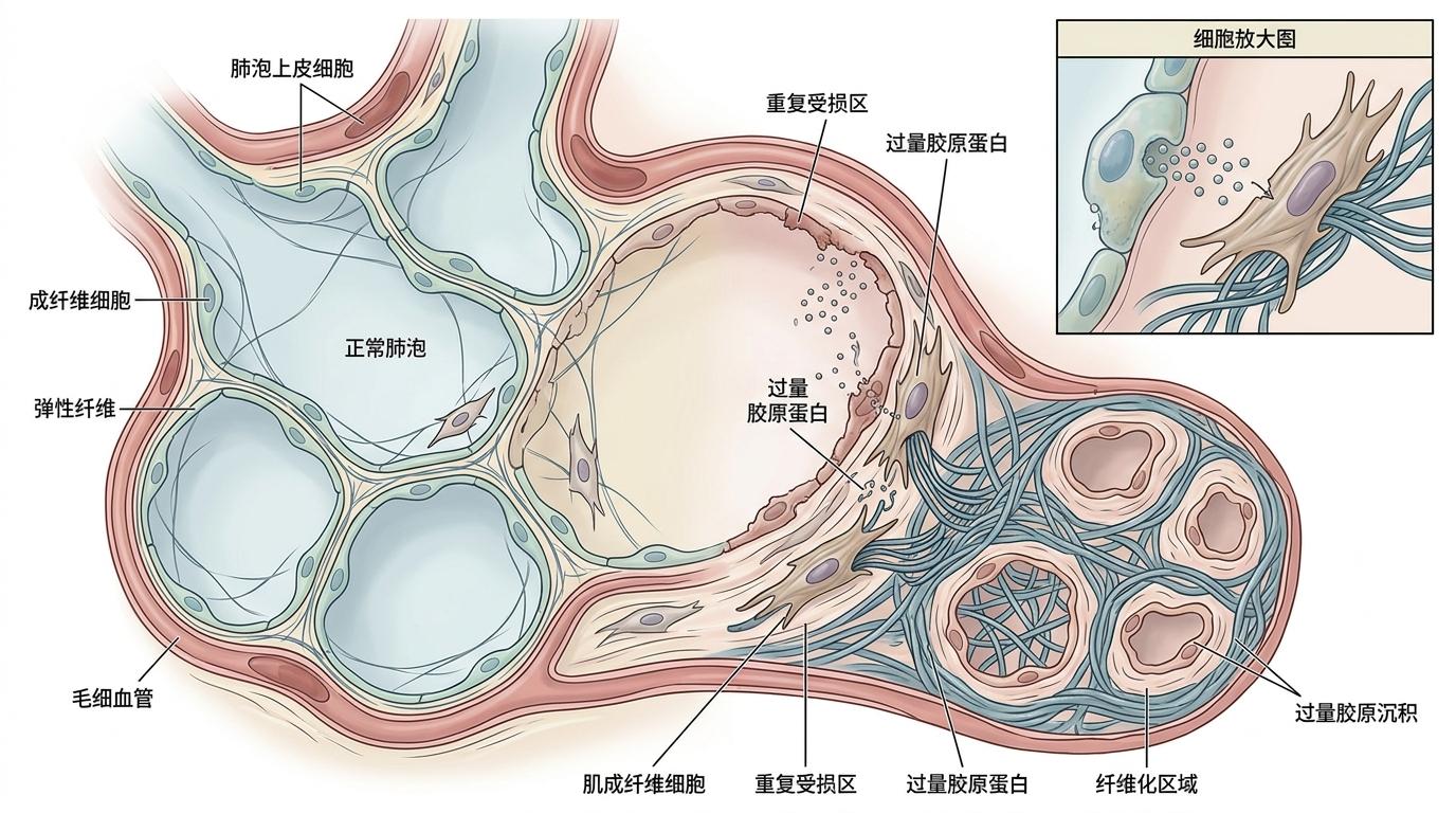 同济大学附属上海市肺科医院的专家解释,肺纤维化的本质是肺组织的“错误修复”。就像厨房墙面破了洞,本该补上新瓷砖,结果却被反复糊上水泥,最后整个墙面硬得像石板,连透气的缝隙都没有。肺泡上皮细胞反复受损后,会分泌大量促纤维化因子,把成纤维细胞“催”成疯狂产胶原的“工作狂”,这些过量的胶原就像乱织的渔网,把肺的弹性一点点勒没。