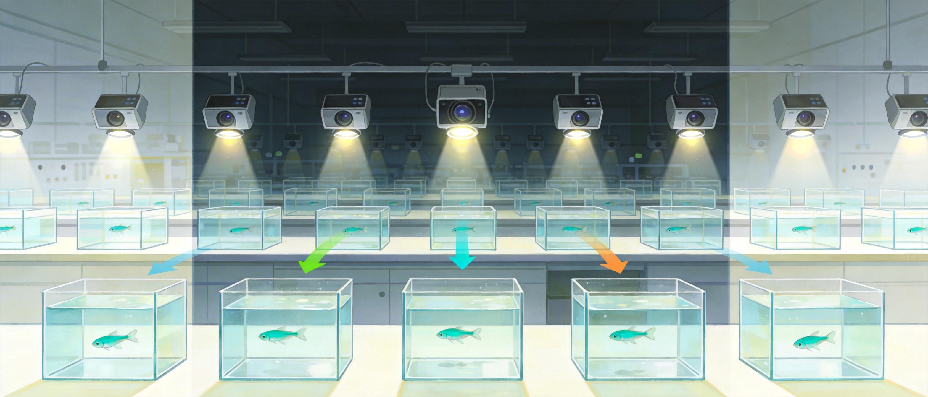 斯坦福的团队决定换个思路:给每条鱼拍一部「生命全程纪录片」。他们选了非洲绿松石鳉鱼——这种鱼从孵化到死亡最多8个月,是实验室里寿命最短的脊椎动物,却和人类共享复杂的大脑结构。81条鱼各住一个带摄像头的水箱,摄像头以20帧/秒的速度全天候拍摄,直到它们自然死亡。