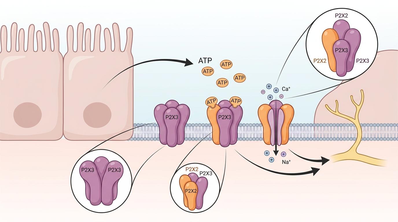 我们的气道里藏着一种叫P2X的「分子开关」——当呼吸道发炎或受刺激时,细胞会释放ATP信号分子,像按开关一样激活P2X3和P2X2/3受体,触发咳嗽反射。其中P2X2/3是个「不对称的三聚体」:它不是三个相同亚基的对称组合,而是1个P2X2加2个P2X3,或是反过来的2个P2X2加1个P2X3。