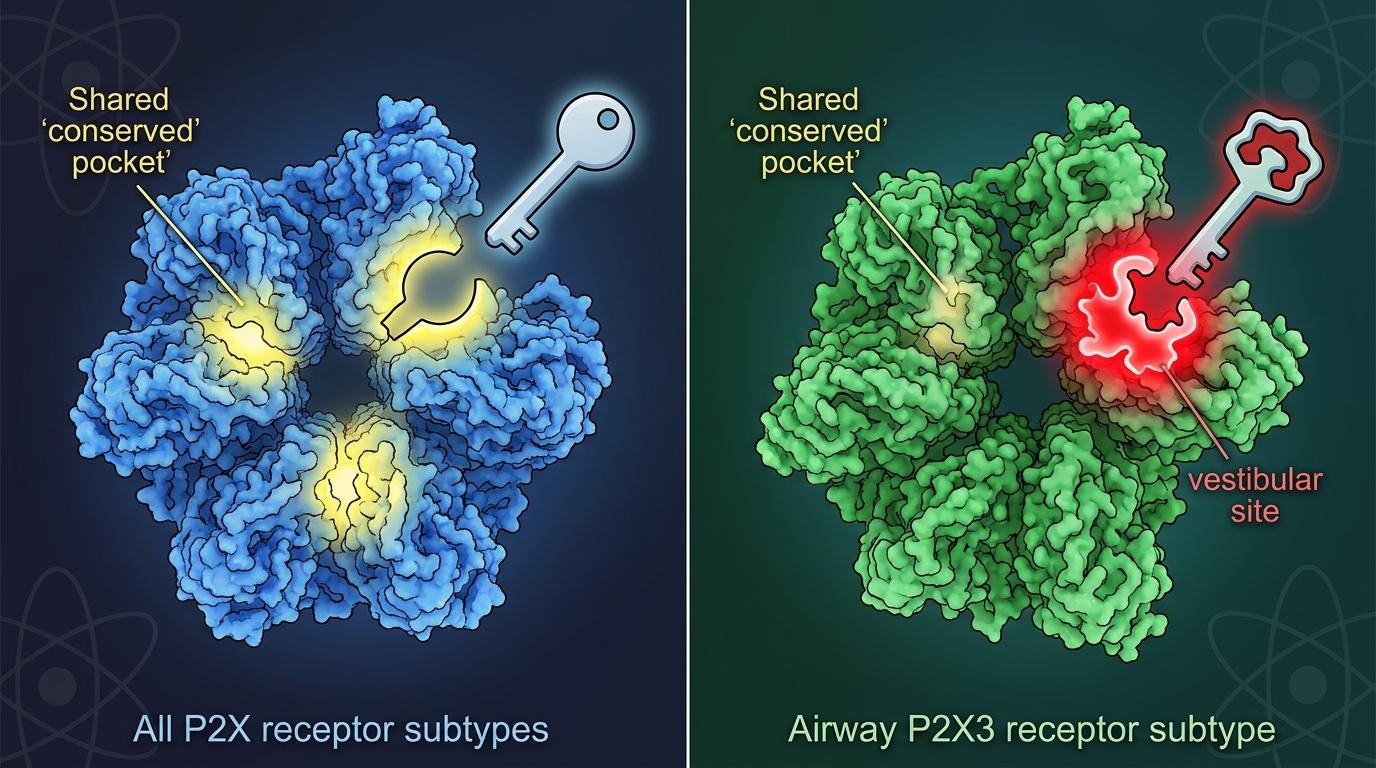 冷冻电镜拍下的结构像一把精准的尺子,第一次把这个通用锁孔和P2X3亚基独有的「专属锁孔」区分开:前者是所有P2X受体共享的保守口袋,后者是只有气道P2X3才有的前庭位点。