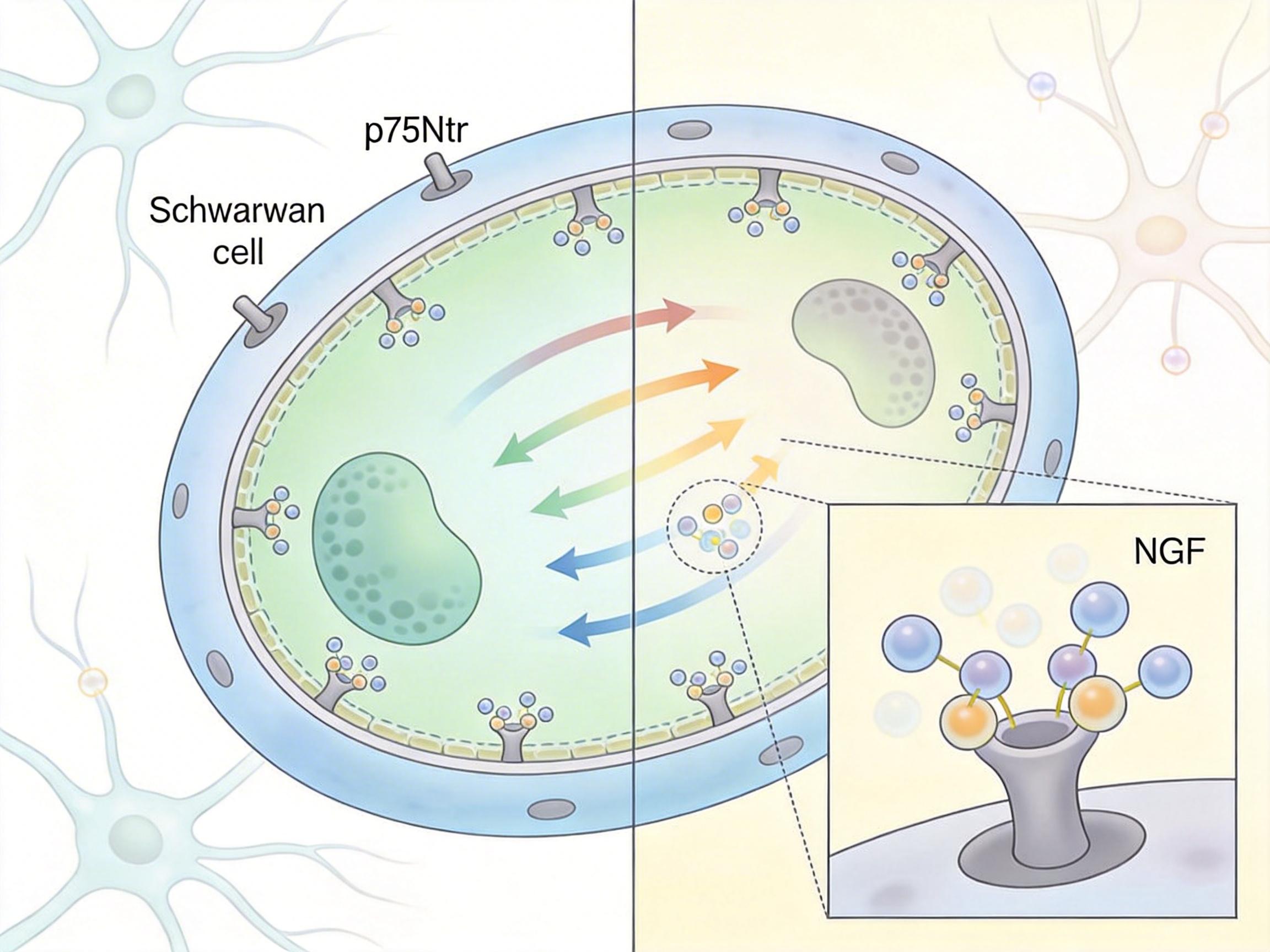 正常情况下,施万细胞表面的p75NTR受体就像个「NGF回收器」,会把多余的NGF抓过来处理掉,不让它在局部堆积。这是一套精密的平衡系统:施万细胞当「缓冲垫」,NGF维持在安全线,神经安安静静传信号。