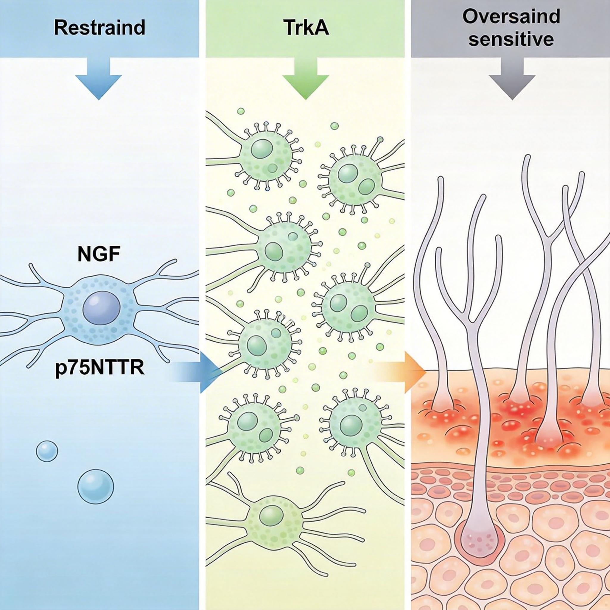 NGF是个双面派:正常量时它是神经的「营养剂」,维持神经存活;一旦过量,就会变成「疼痛放大器」——激活神经上的TrkA受体,让神经变得异常敏感,轻轻碰一下都像在扎针。