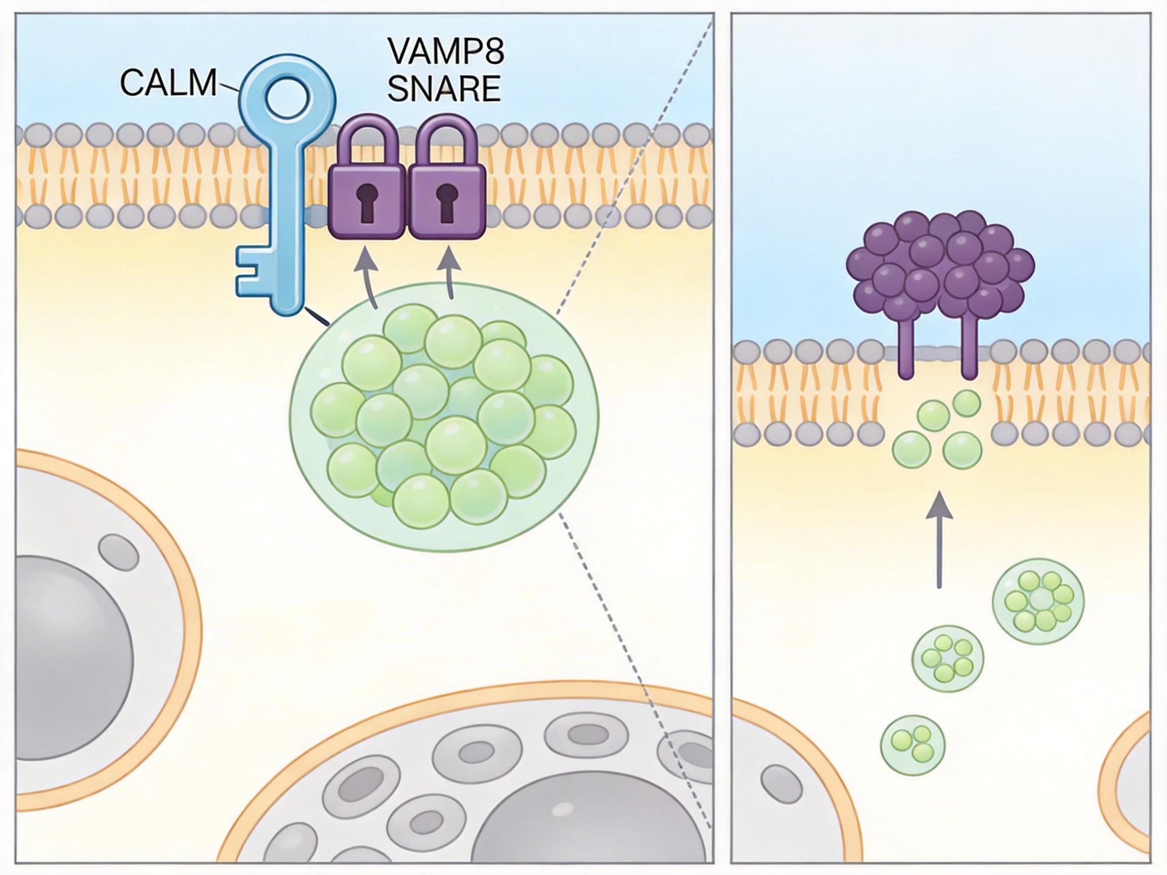当然,VAMP8也不是单打独斗,它还有个专属搭档叫CALM——一种能识别并招募VAMP8的适配蛋白。如果把VAMP8比作补货员,CALM就是负责把补货员派到正确岗位的调度。