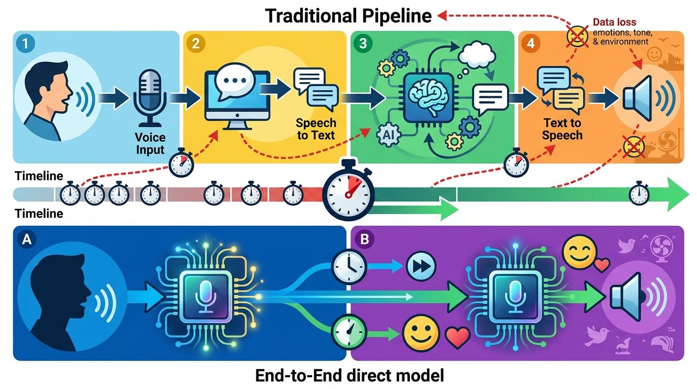 传统语音交互像一条流水线:先把你的声音转成文字,再让AI读懂文字生成回复,最后把文字转回语音。每多一道工序,就多一分延迟,也多一分丢失语气、情绪这些细腻信息的可能。端到端模型则像一个直接对接的联络员,从你开口的第一秒就接收完整的语音信号,跳过所有中间转换,直接生成语音回复。这不仅把延迟压缩到了人类对话的自然区间,还能完整捕捉你说话时的停顿、语调,甚至背景里的环境线索。