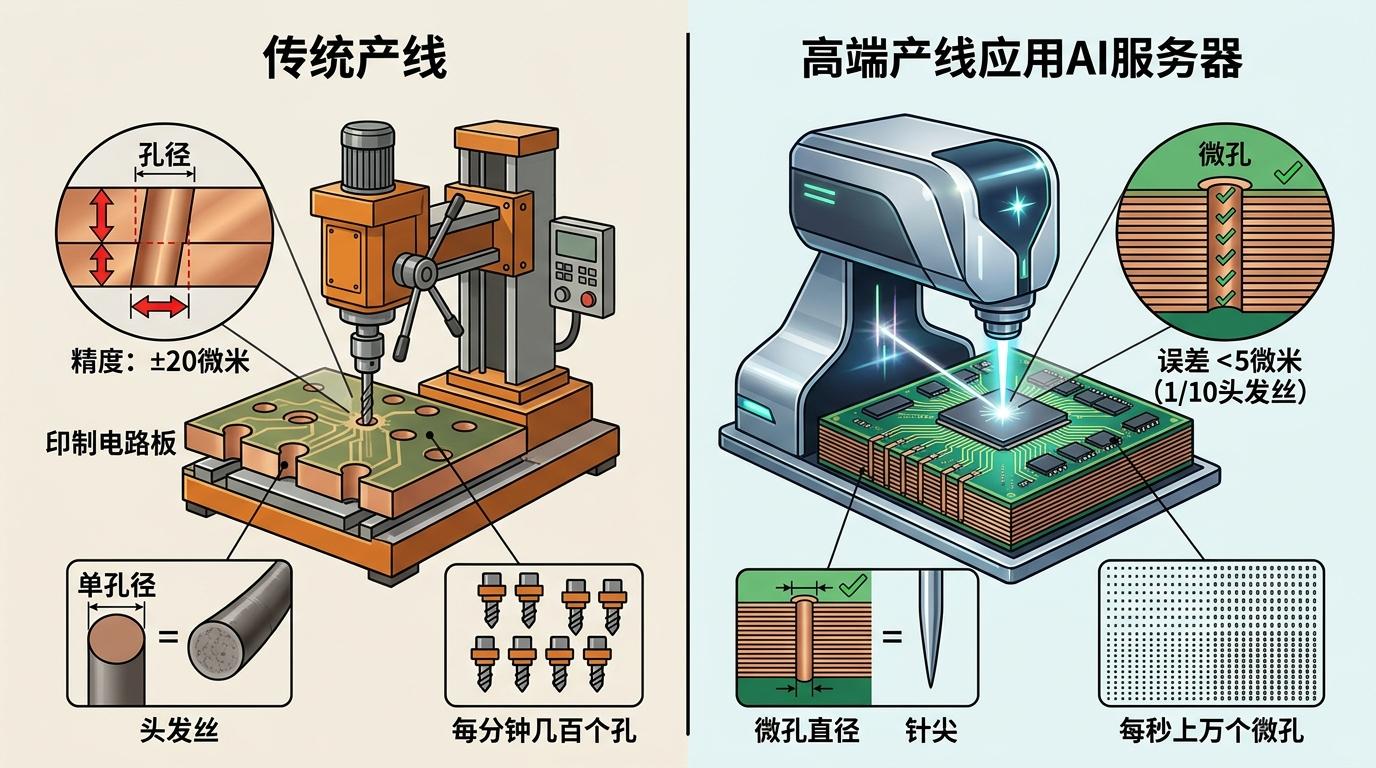 传统PCB产线的钻孔精度通常在±20微米,而AI服务器用的高端PCB要求对准误差小于5微米,相当于一根头发丝直径的1/10。核心设备上,传统产线用的普通钻孔机,每分钟最多钻几百个孔;高端产线的激光钻孔机,能在每秒打出上万个直径0.1毫米以下的微孔——这个尺寸比针尖还小。