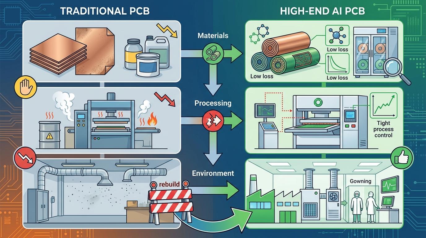 你可以把传统PCB产线想象成县城里的普通印刷厂,能印报纸、传单,应付日常需求;而高端AI PCB产线则是能印刷精密电路图的工业级印刷厂——两者看似都是「印刷」,但精度、设备、材料的差距,已经是天壤之别。