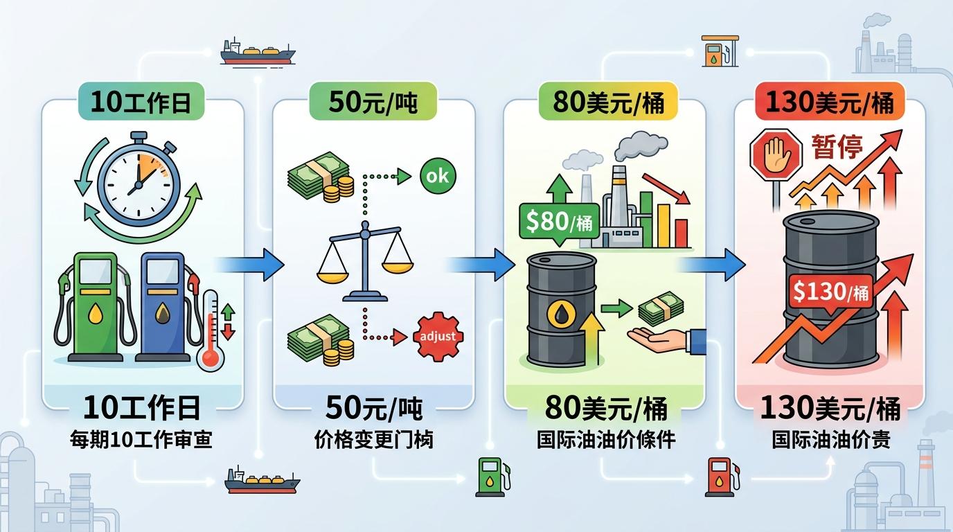 你可以把国内成品油定价机制想象成一个带减震的弹簧——它不跟国际油价硬刚,而是用三层规则缓冲波动:每10个工作日调一次价,涨跌低于50元/吨就“按兵不动”;国际油价超过80美元/桶,就压缩炼油厂利润给市场“贴钱”;要是突破130美元/桶,干脆可以暂停涨价。