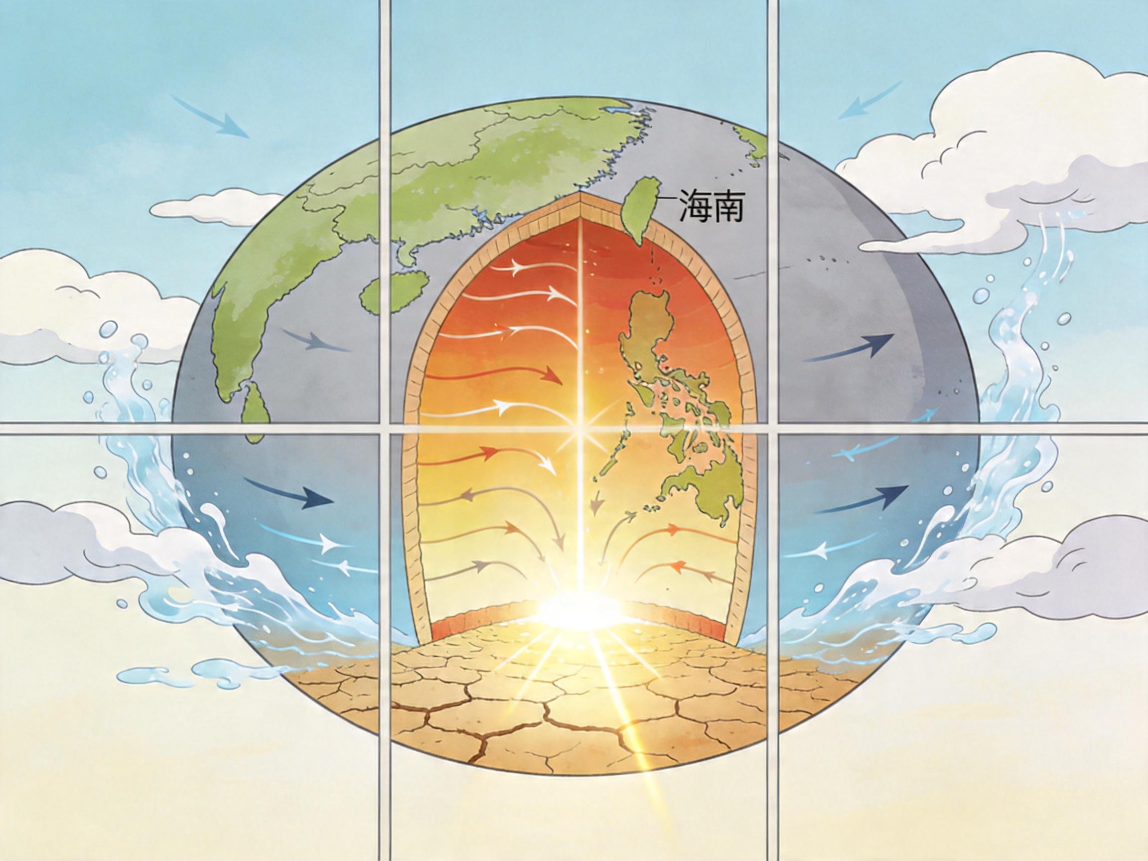 先得认识第一个幕后推手:西北太平洋副热带高压。这个盘踞在北半球副热带地区的巨大暖高压系统,像一床密不透风的干热棉被,一旦在海南上空稳定下来,就会把云层和水汽统统挤走,只留下刺眼的阳光直射地表。它带来的下沉气流还会像个无形的锅盖,把地面散发的热气牢牢锁在近地面层——就像你把刚出锅的菜扣在玻璃罩里,温度只会越焖越高。在它的控制下,海南北部和西部先迎来了一轮基础高温,地表像被架上了文火慢烤。