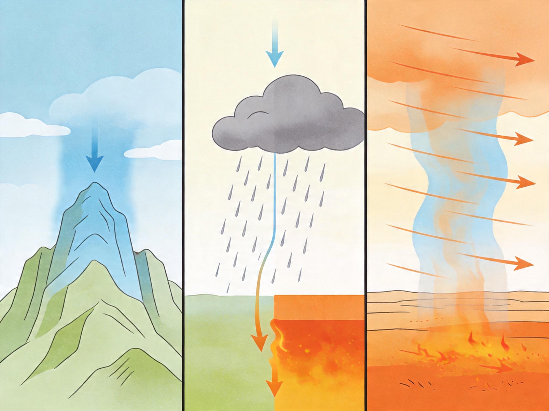但真正让温度突破纪录的,是五指山送来的第二股热风——焚风。当副热带高压带来的暖湿气流撞上海南中部的五指山山脉,就像水流撞上礁石:一部分在迎风坡爬升、冷却,把水汽变成雨水留在山上,剩下的干热空气则顺着背风坡急剧下沉。这个过程中,空气被快速压缩升温,每下降100米,气温就能升高约1℃,湿度却骤降,最终变成一股滚烫的干热风,直直扑向北部和西部的平原。如果说副热带高压是文火,那焚风就是猛地浇在炭火上的汽油——两者一叠加,地表温度瞬间被推到了极值。