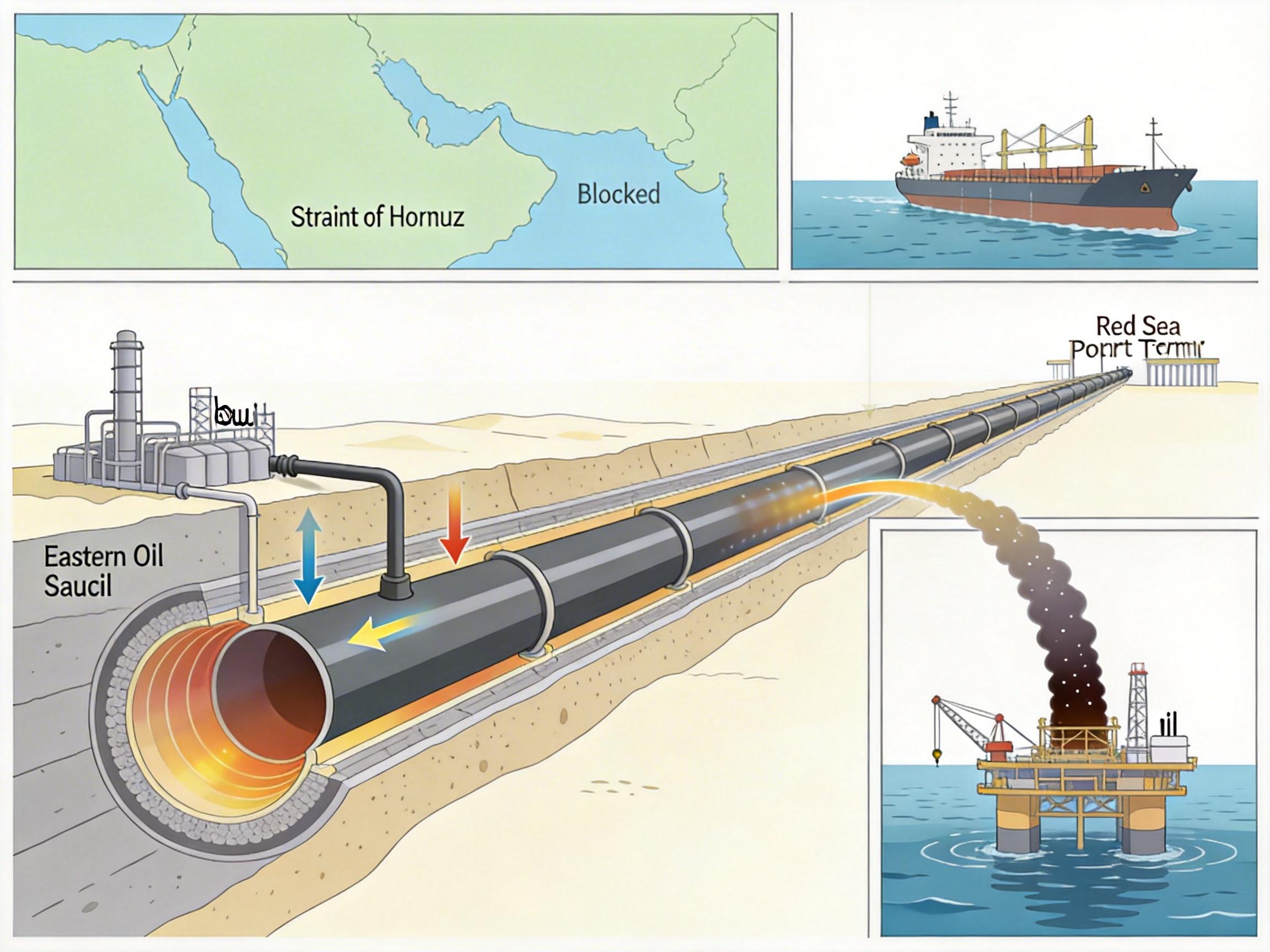 这条长1200公里的管道,原本是1980年代两伊战争期间沙特埋下的“后手”——绕过霍尔木兹海峡,把东部油田的原油直接送到红海延布港出口。在和平年代,它的存在感并不强,霍尔木兹海峡承担着沙特90%以上的石油海运量。但2026年2月底霍尔木兹海峡被封锁后,一切都变了:沙特被迫关停了萨法尼亚、马坚等海上油田,95%的石油出口转向这条设计最大运力700万桶/日的管道,其中约500万桶用于出口,剩下的200万桶要供应国内红海沿岸的炼厂、电厂和海水淡化厂。