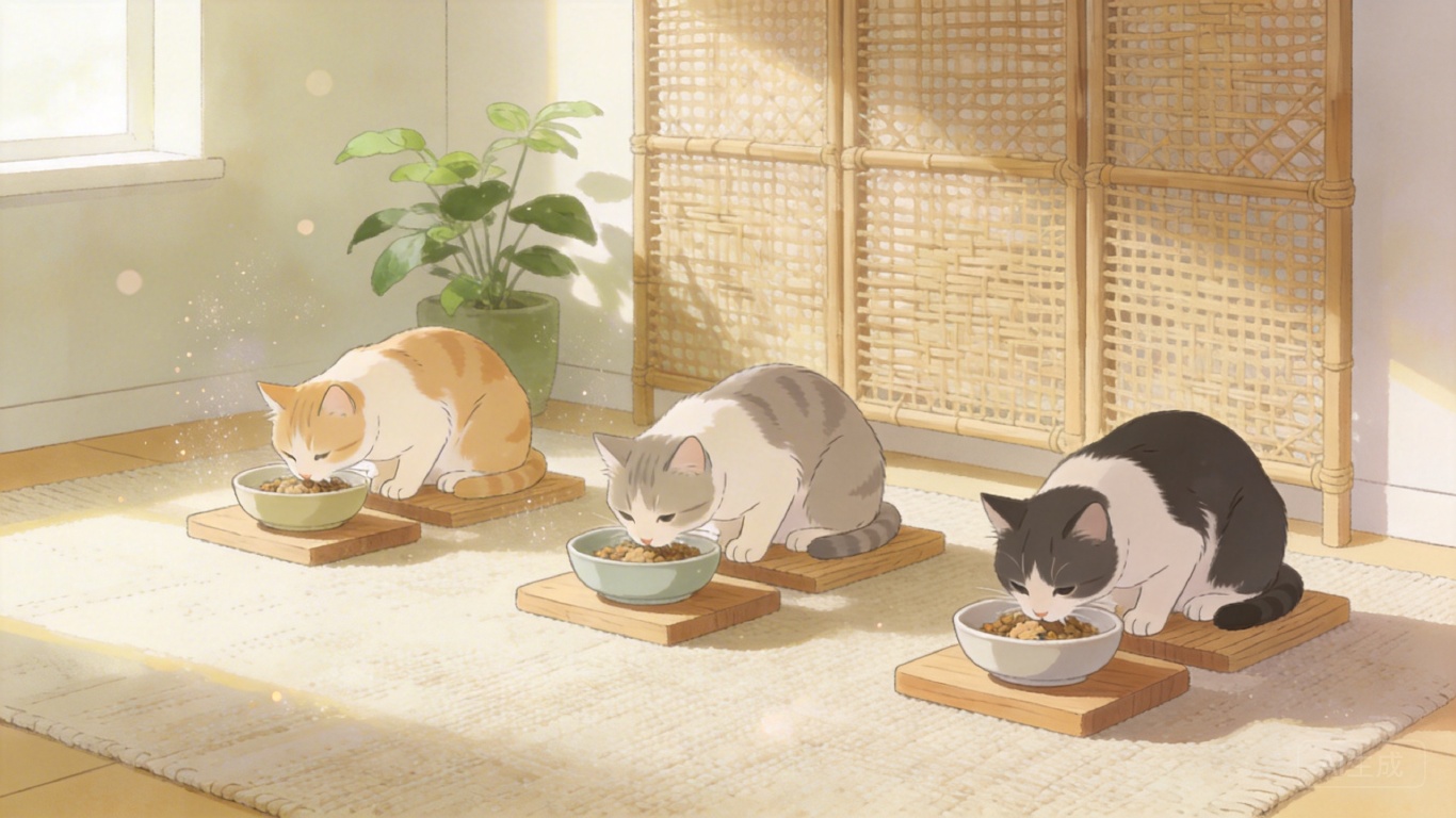 清晨的厨房台面上,三只猫的食碗挤成一簇——你可能觉得这是温馨的喂食时刻,可猫的耳朵正贴着后脑勺,尾巴尖在桌沿紧张地抽动。英国一项覆盖565户家庭的调查显示,20%的多猫家庭共用一个食碗,69%让猫咪共用水碗,而这些看似省事的布置,正悄悄推高猫咪的压力激素水平。为什么我们习以为常的场景,对猫来说却是一场无声的对峙?