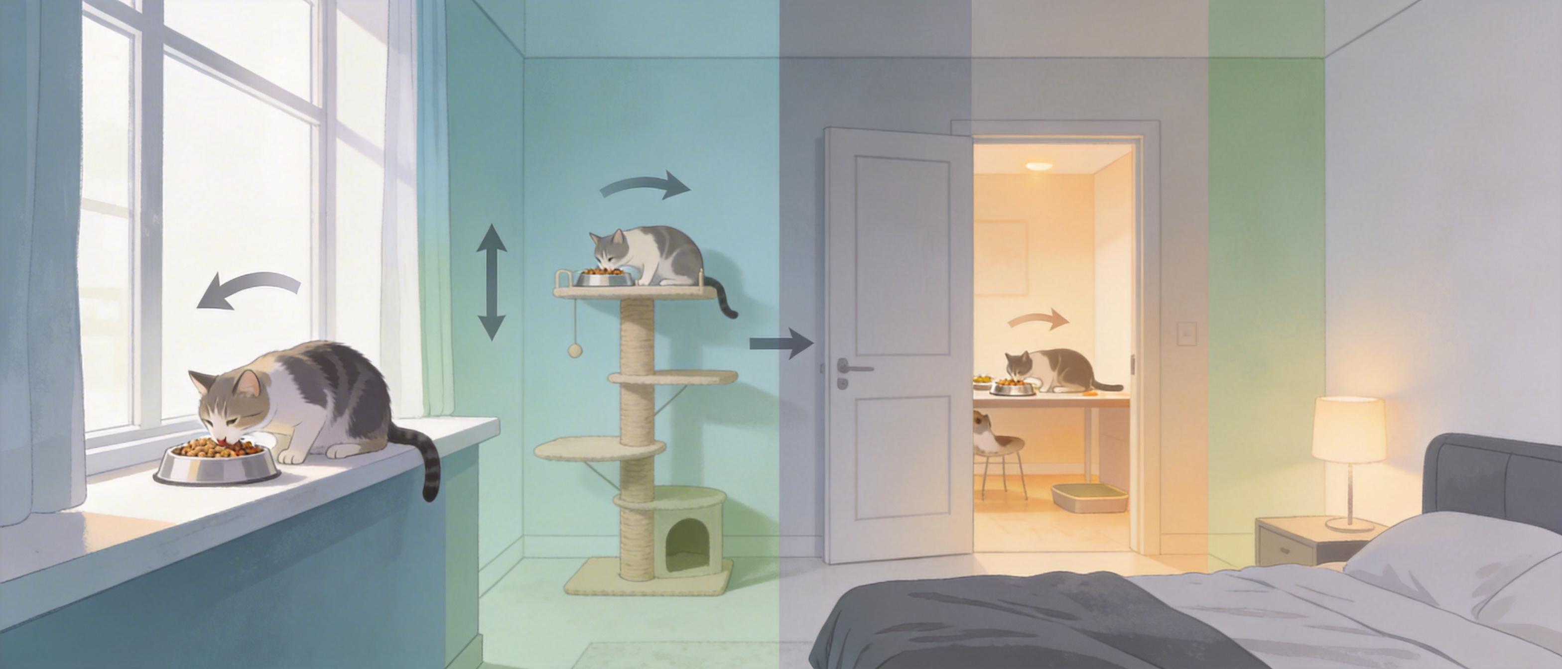 你或许见过有的猫吃饭时狼吞虎咽,吃完还对着同伴哈气——这不是贪吃,是焦虑。波兰一项针对收容所猫的研究发现,资源分散的环境中,猫的毛发皮质醇水平比资源集中的环境低近50%。多猫家庭里,哪怕是关系亲密的猫,也需要各自的「私人餐厅」:可以把一只猫的食碗放在卧室窗台,另一只放在客厅猫爬架的中层,让它们进食时看不到彼此。如果家里还有狗,就得把猫的食碗放在狗够不到的高处,或者单独开辟一间猫用餐室,毕竟连我们都不想吃饭时被别人盯着,何况是天生警惕的猫。