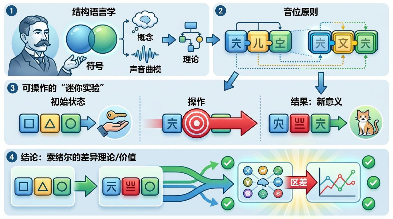 1916年,瑞士语言学家费迪南·德·索绪尔的《普通语言学教程》出版,彻底推翻了“语言是现实标签”的传统认知。他提出的索绪尔差异理论,核心一句话就能讲透:语言符号的意义,不是来自词和现实的直接对应,而是来自语言系统内部的差异关系。