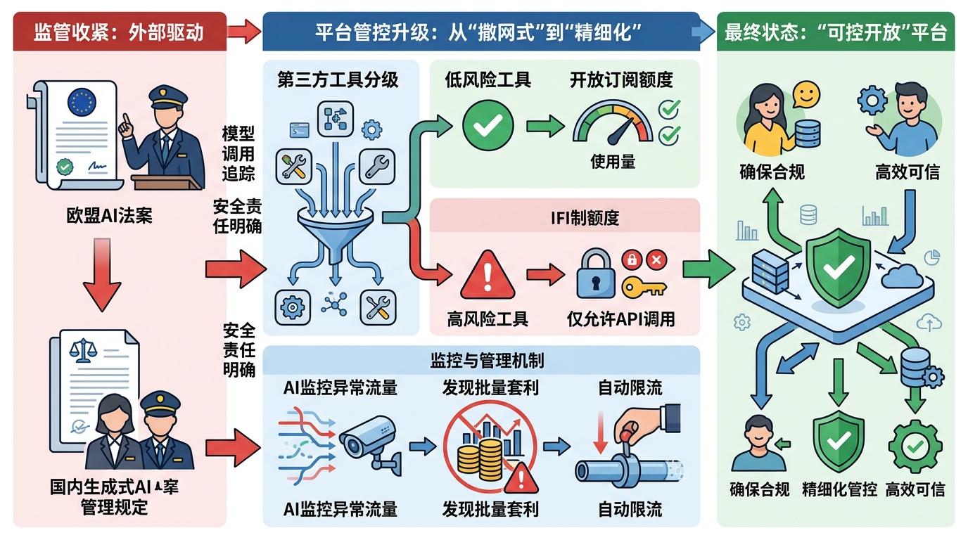监管的收紧正在倒逼平台走向“可控开放”。欧盟AI法案要求平台必须能追踪每一次模型调用,确保合规;国内的生成式AI管理规定也明确了第三方接入的安全责任。平台不得不从“撒网式开放”转向“精细化管控”:给第三方工具分级,对低风险工具开放订阅额度,高风险工具只允许API调用;同时用AI监控异常流量,一旦发现批量套利就自动限流。