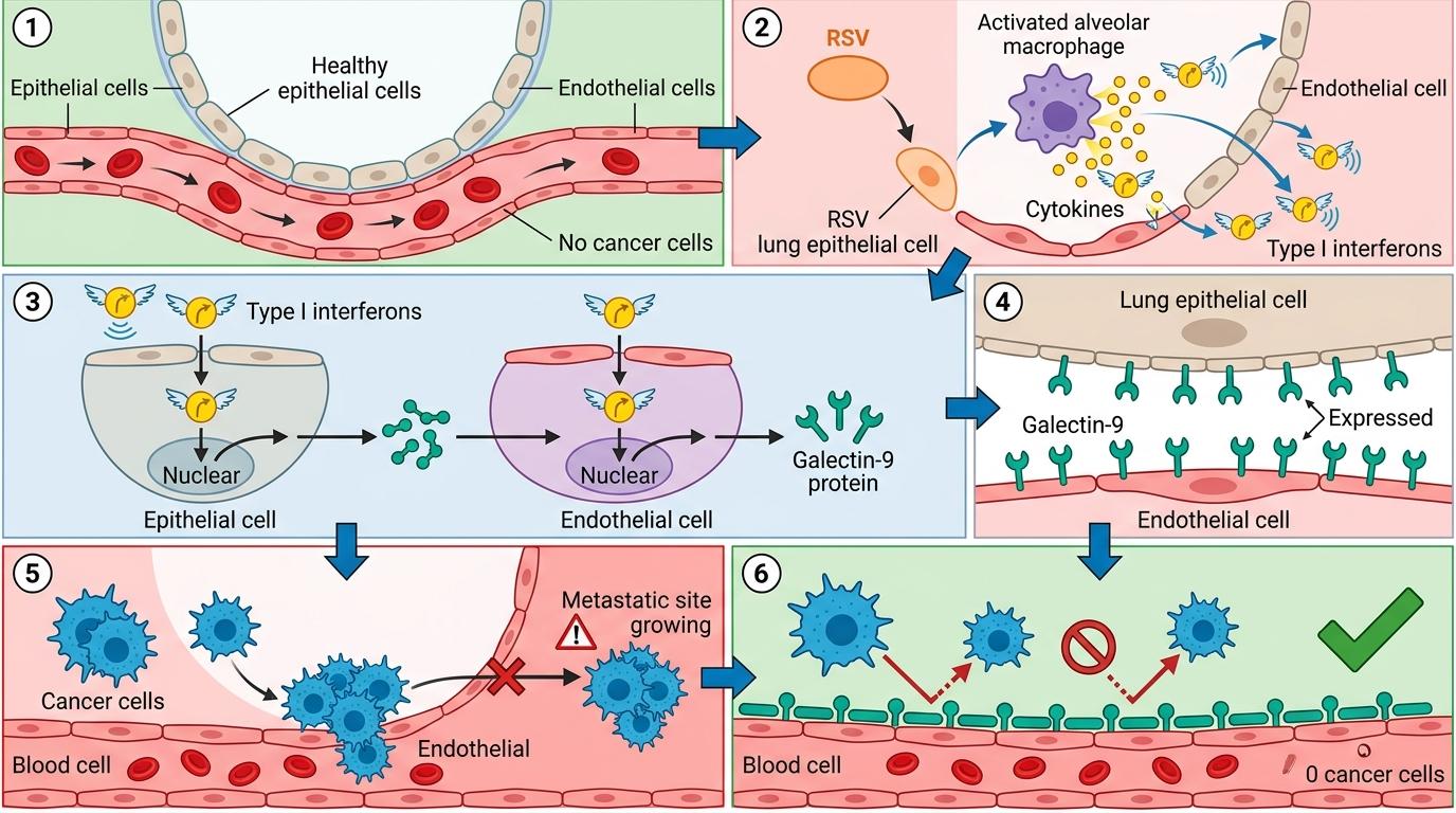 具体来说,RSV感染后,肺泡巨噬细胞会最先察觉病毒,迅速释放I型干扰素。这些干扰素像一个个带着指令的小信使,钻进肺上皮细胞和血管内皮细胞里,激活上百种干扰素刺激基因(ISGs)。其中最关键的是一种叫Galectin-9的蛋白,它会像胶水一样,改变肺组织表面的“黏性”,让从血液里飘过来的癌细胞找不到可以附着的“锚点”。