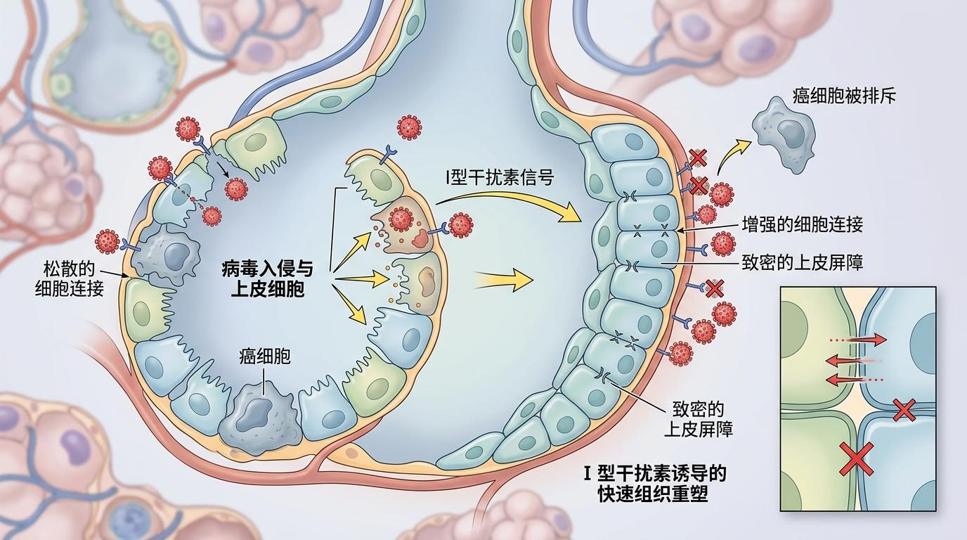 你可以把I型干扰素想象成肺部的“紧急改造师”——当病毒入侵时,它会在24小时内给肺组织做一场“装修”:原本对癌细胞“敞开大门”的肺上皮细胞,会被调整成“生人勿近”的状态。
