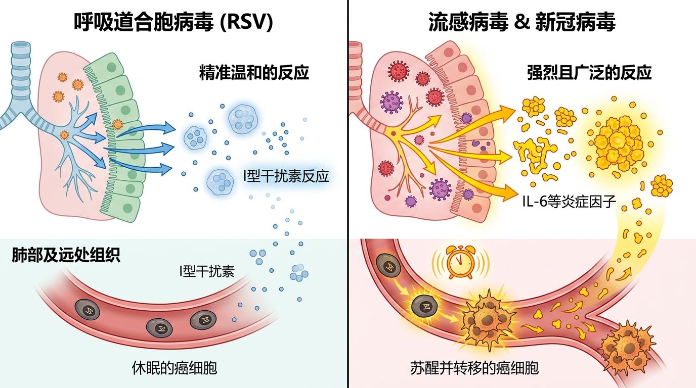 区别就在于炎症的“度”:RSV触发的是精准的I型干扰素反应,主要作用于肺上皮细胞,炎症反应温和且短暂;而流感和新冠会引发大量IL-6等炎症因子,这些因子像“唤醒闹钟”,能让沉睡的癌细胞从休眠状态苏醒,快速形成转移灶。