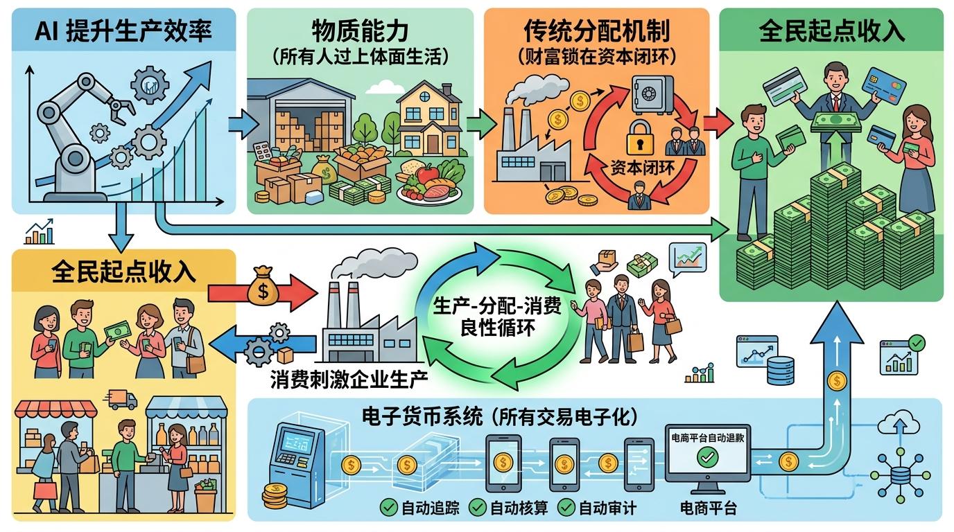 这背后的逻辑是:AI让社会生产效率呈指数级提升,我们早已具备让所有人过上体面生活的物质能力,但传统分配机制把财富锁在了资本的闭环里。当每个人都有了稳定的“起点收入”,会把钱重新投入消费,反过来刺激企业生产,形成“生产-分配-消费”的良性循环。而这一切的基础是电子货币系统——只有所有交易都电子化,才能实现自动追踪、核算和审计,让分配过程像电商平台的自动退款一样透明。