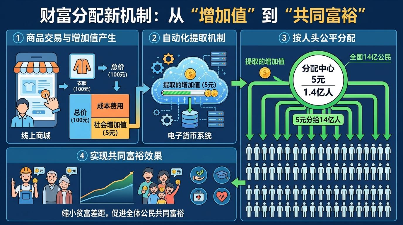 最现实的问题是:这笔钱从哪来?黄文政的答案是从每一笔交易的“增加值”里抽成——类似增值税,但不是进入国库,而是直接通过电子货币系统分给所有公民。比如你在网上买了一件100元的衣服,其中有5元是这件商品带来的社会增加值,这5元会被系统自动提取,按人头分给全国14亿人。