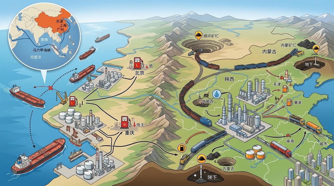 煤液化从诞生起就不是能源领域的“优等生”:它的生产成本比传统炼油高,每生产1吨油要消耗3-4吨煤、7-12吨水,碳排放更是传统石油的2倍多。但在能源安全的语境里,它的价值从来不是“经济最优”,而是“绝对可控”。 中国的石油进口依赖度常年超过70%,80%的进口石油要经过马六甲海峡——一旦这条“海上生命线”被封锁,国内的油品供应会在数周内陷入紧张。而煤炭是中国储量最丰富的能源,2024年煤炭产量超46亿吨,且主要分布在内蒙古、陕西等内陆地区,运输完全不受海上通道限制。只要有煤,就能通过煤液化工厂生产出汽油、柴油,甚至航空燃料,相当于把能源安全的主动权攥在了自己手里。