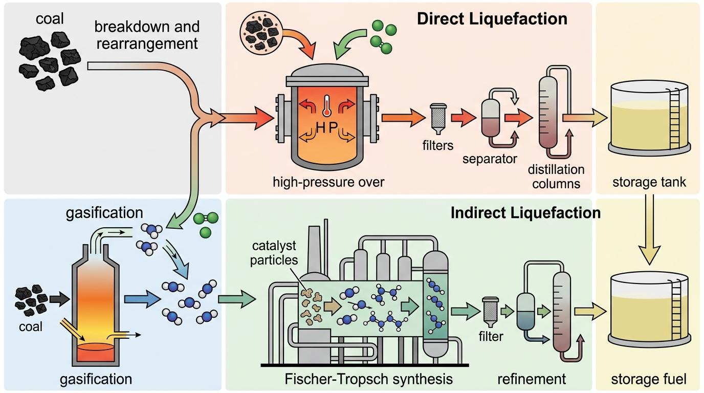 煤液化的本质,就是把固态煤炭“拆碎重组”成液态燃料,主要分两条技术路线:直接液化是把煤扔进高温高压的“加氢高压锅”,直接和氢气反应生成油;间接液化则先把煤气化成一氧化碳和氢气的混合气体,再通过费托合成反应“组装”成油。