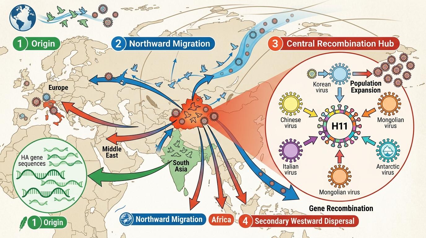 研究人员分析了全球1179条H11病毒的HA基因序列,发现它的扩散轨迹完全贴合候鸟迁徙路线:从南亚的越冬地北上,在新疆完成基因重组和种群扩增,再向西飞向欧洲、中东和非洲。新疆分离出的两株H11病毒,基因片段分别来自中国、韩国、意大利、蒙古甚至南极洲——就像带着多国护照的旅行者,每一段基因都标记着它的迁徙足迹。