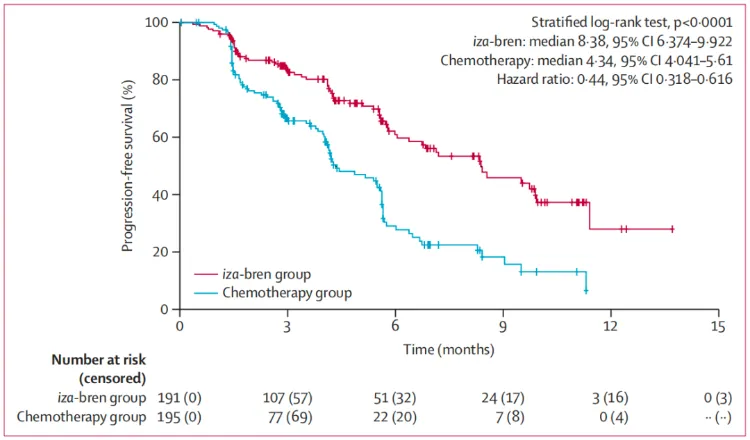 2025年10月19日,国际顶尖医学期刊《柳叶刀》刊登了一项足以改写临床实践的研究。由中山大学肿瘤防治中心张力教授团队牵头,联合全国55家医院共同完成的3期临床试验结果,宣告了一款中国原创抗癌新药的决定性胜利。这款名为伦康依隆妥单抗(iza-bren)的药物,为那些已历经多线治疗失败的晚期鼻咽癌患者带来了前所未有的生机。数据是冰冷的,但其背后的意义却温暖人心:接受iza-bren治疗的患者,肿瘤客观缓解率(即肿瘤显著缩小)高达54.6%,而接受标准化疗的对照组仅为27.0%。这意味着,超过一半走投无路的患者,看到了肿瘤被有效遏制的希望。更关键的是,患者的无进展生存期也从4.34个月延长至8.38个月,几乎翻了一番。这是全球首个在晚期鼻咽癌后线治疗中取得成功的随机3期临床研究,它不仅为患者提供了新的选择,更树立了新的治疗标杆。