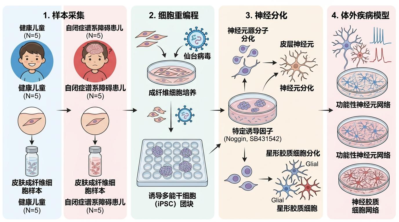 要搞懂孩子的大脑出了什么问题,直接取脑组织显然不可能。科学家们想了个办法:从5名患儿和5名健康孩子身上取一小块皮肤,用仙台病毒把这些皮肤成纤维细胞“重编程”——也就是把普通细胞变回能长成任何人体组织的诱导多能干细胞(iPSC),再引导它们长成大脑皮层的神经元和星形胶质细胞。