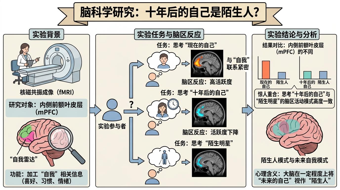 内侧前额叶皮层(medial prefrontal cortex)是大脑的「自我雷达」,当你想自己的喜好、习惯、当下的情绪时,这个区域会亮起。但UCLA的神经科学家Hal Hershfield做了个实验:让参与者分别想「现在的自己」和「十年后的自己」,同时用fMRI扫描大脑。结果发现,想十年后的自己时,内侧前额叶皮层的活跃度下降了一大截,反而和想一个陌生明星时的脑区激活高度重合。