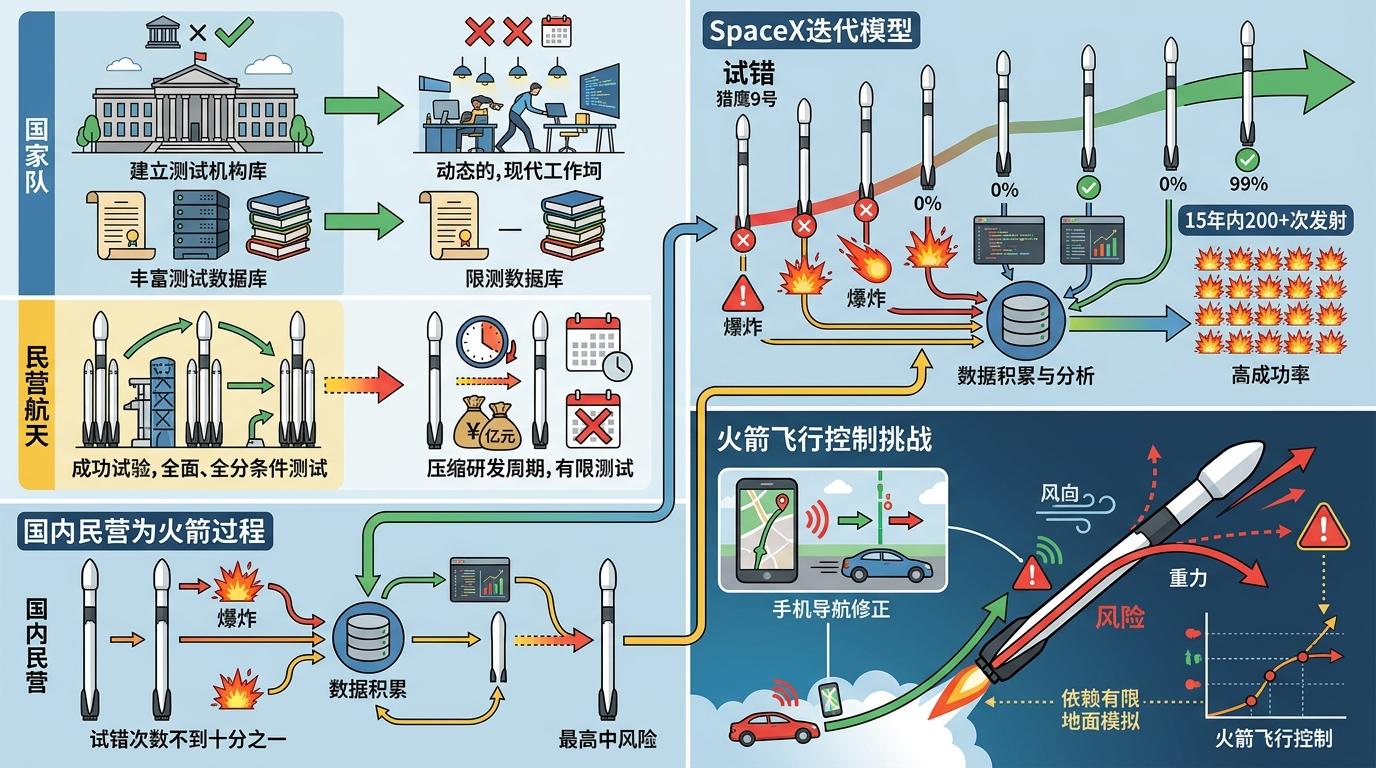更现实的挑战藏在地面。民营航天的研发周期往往被资本和市场压缩到极致,他们没有国家队几十年积累的测试数据库,也难以承担动辄上亿元的全工况试验成本。SpaceX能在15年里把猎鹰9号的发射成功率从0%提到99%,靠的是200多次发射、数十次爆炸换来的数据;而国内民营团队的试错次数,还不到这个数字的十分之一。当你用手机导航都需要实时修正路线时,火箭的飞行控制却只能依赖有限的地面模拟,风险可想而知。