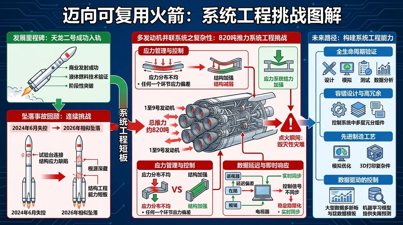 这已经是该团队第二次在同类测试中遭遇意外。2024年6月的那次失控,曾被归因为试验台连接结构的应力设计缺陷,但两年后相似的坠落说明,问题的根源或许埋得更深。作为国内民营液体火箭的先行者,他们曾靠天龙二号的成功入轨打破国有火箭的垄断,如今却在迈向可复用的关键节点上反复卡壳。业内的共识是,这不是某一个部件的失误,而是系统工程能力的短板——当你把9台推力合计820吨的发动机绑在一起,任何一个环节的应力偏差、数据延迟,都可能在点火瞬间演变成毁灭性的灾难。