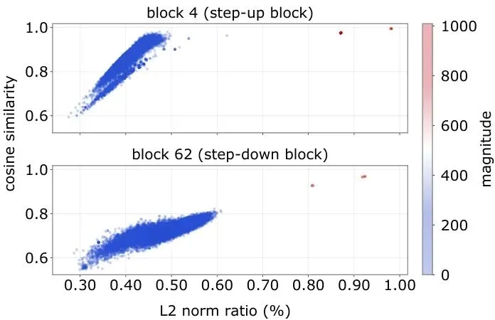 被放大的激活值会通过残差连接像滚雪球一样在模型里传递,形成一个稳定的“高能量平台”,直到最后几层才被反向的激活信号抵消。整个过程像一场精准的外科手术:早期“抬升”,中期“维持”,晚期“中和”。