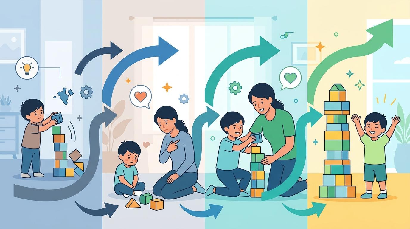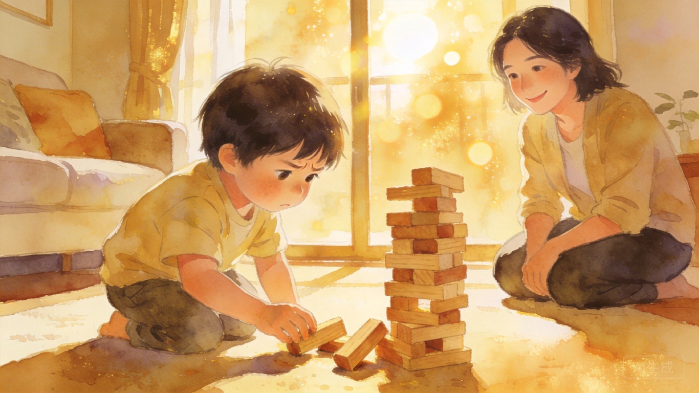韧性的养成,从允许孩子“小失败”开始。幼儿期摔一跤、搭积木塌了,别立刻冲过去补救——那等于告诉孩子“你搞不定”。试着说出他的情绪:“积木倒了,你好失望对不对?”帮他把模糊的感受变成清晰的词汇,就是在教他和情绪共处,而不是被情绪控制。这时候的“不帮忙”,其实是在给孩子的自我效能感搭地基:他会慢慢相信,哪怕搞砸了,也能再试一次。