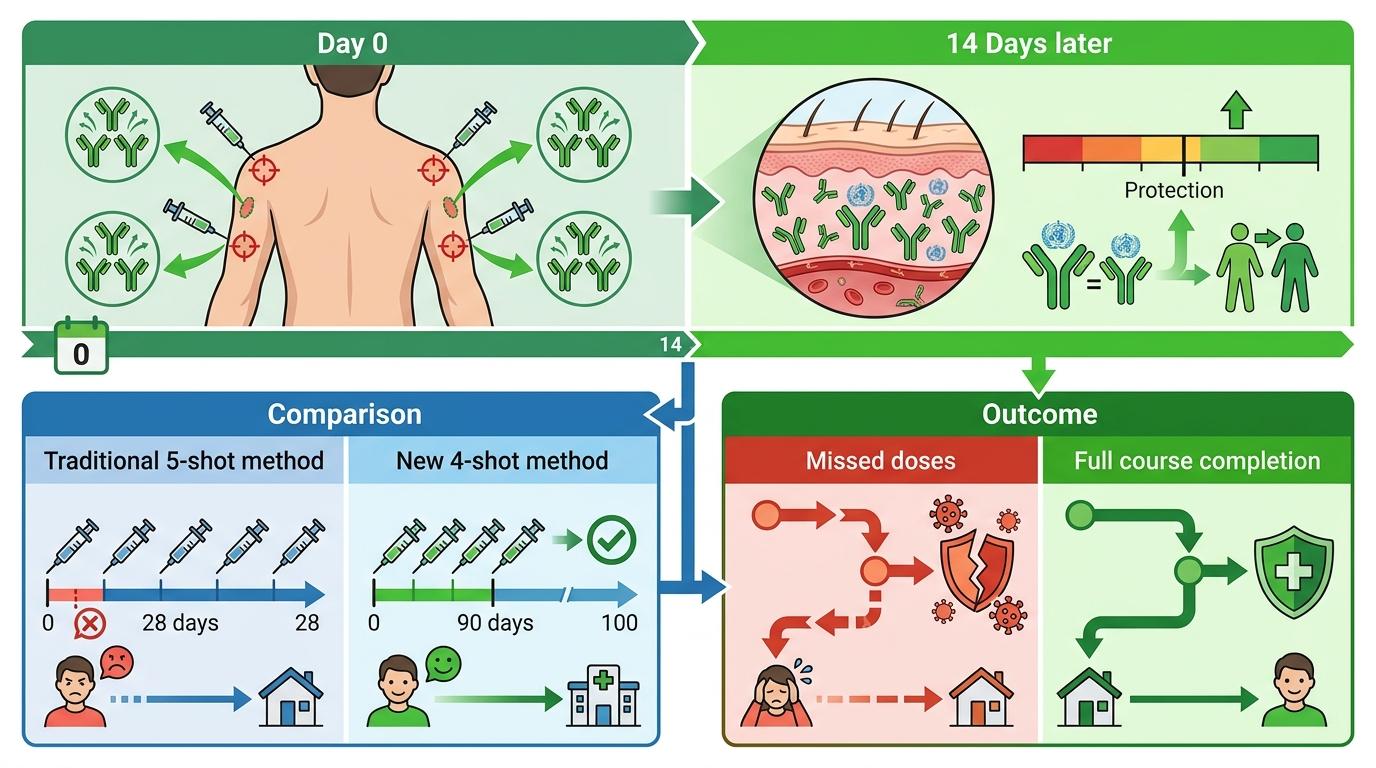 这种4针法的核心,是在第0天就给皮肤的四个不同部位各打一针,相当于同时激活四组「侦察兵」部队。临床数据显示,接种后14天,所有受试者的中和抗体水平都达到了WHO规定的保护阈值(≥0.5 IU/mL),和传统5针肌内注射的效果完全相当。更关键的是,它把原本28天的接种周期压缩到了90天内的4次就诊,减少了患者跑医院的次数,也降低了因为嫌麻烦而漏种的风险——对那些住在偏远地区、或者时间紧张的人来说,这可能就是「能完成全程接种」和「功亏一篑」的区别。