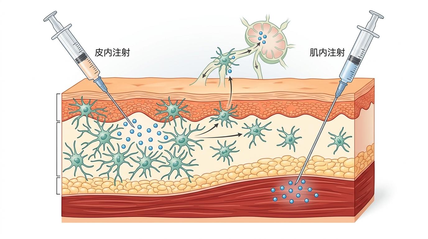 皮肤不是一层简单的屏障,它的表皮和真皮层里住着密密麻麻的树突状细胞——这些是免疫系统的「侦察兵」,能第一时间捕捉到入侵的抗原,再火速传递给淋巴结里的免疫细胞启动应答。传统的肌内注射,疫苗要穿过厚厚的肌肉组织才能被免疫细胞发现;而皮内注射直接把疫苗送进「侦察兵」的大本营,用更少的剂量就能触发更快速、更强烈的免疫反应。就像把火种直接扔进干柴堆,而不是隔着泥土点烟,效率天差地别。