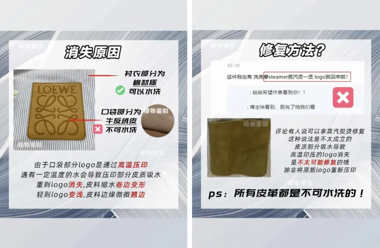 “翻车”事故由此频发。工厂的一台干洗机一次能洗上百件衣服,分拣员很难像小店老板那样仔细检查每一件衣物的水洗标和特殊材质。logo为何会脱落?这不仅关乎洗涤方式,更与服装本身的制作工艺息息相关。热转印、冷转印、胶贴等工艺牢固度各异,加上部分品牌为压缩成本使用劣质胶水,logo的脱落本就存在风险。当一件需要特殊干洗的牛反绒皮衬衫,被错误地归入水洗流程,六千元瞬间变六十元的故事便不再是笑话。
