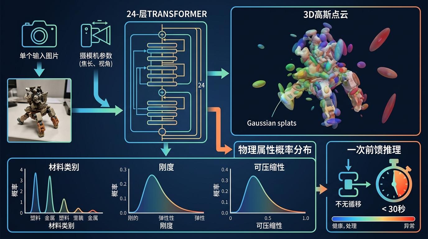 它用一个24层Transformer做核心,输入单张图片和相机参数后,同时输出两个关键结果:一个是3D高斯点云——用一堆带颜色、位置和形状的‘光斑’快速重建物体的3D结构;另一个是物理属性的概率分布,直接给出材料类别、刚度和可压缩性的可能范围。整个过程是一次前馈推理,不用迭代,30秒内就能拿到所有参数。