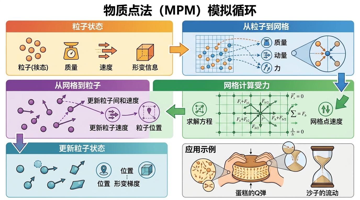 接下来是**物质点法(MPM)**的舞台——你可以把它想象成给每个高斯点安上‘物理大脑’:每个点携带质量、速度和形变信息,先把这些信息映射到背景网格上计算受力,再把网格的受力结果还给每个点更新状态。蛋糕的Q弹、沙子的流动,全靠这套粒子-网格的双向传递实现。