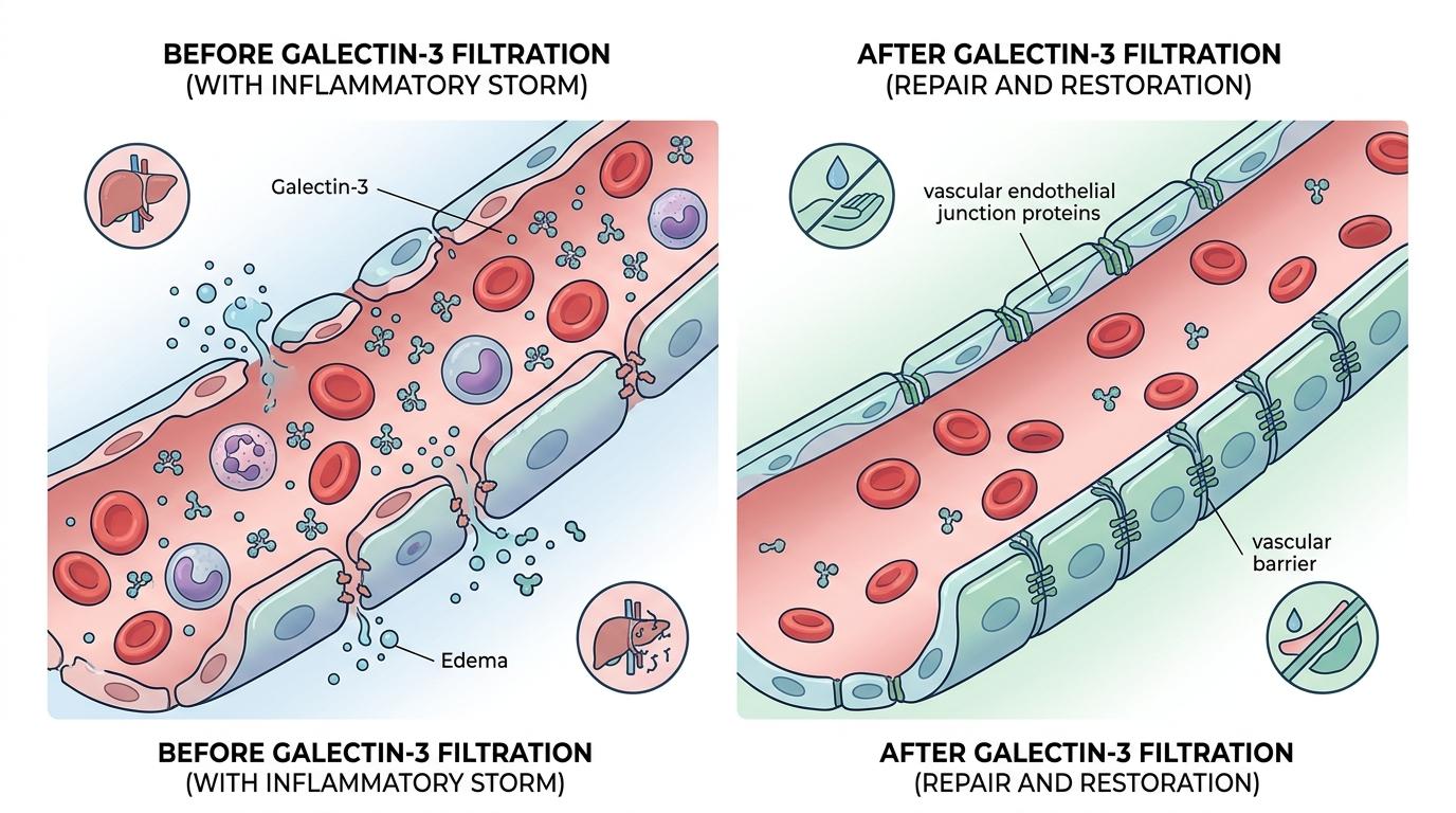 更值得关注的是,多组学分析显示,滤除半乳糖凝集素-3后,动物体内的血管内皮连接蛋白明显增多——这意味着原本被炎症风暴冲垮的血管屏障,开始重新修复,器官损伤的连锁反应被打断了。