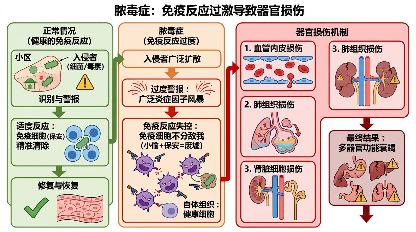 你可以把这个过程想象成:小区里进了小偷,本该只叫保安,结果管家直接拉响了全城警报,特警、消防车甚至轰炸机全来了,把整个小区炸成了废墟。脓毒症里的器官损伤,就是这么来的:过度激活的免疫细胞不分敌我,连自己的血管内皮、肺组织、肾脏细胞一起攻击。
