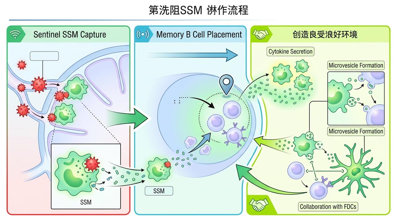 你可以把SSMs想象成淋巴结门口的「哨兵」,它们的任务不是直接消灭病原体,而是精准捕获抗原,然后把信号传递给记忆B细胞。加文研究所的实验显示,正是这些SSMs在初次接种后被激活,给引流淋巴结里的记忆B细胞「留了位置」:它们会分泌特定的细胞因子,还会通过微囊泡和滤泡树突状细胞协作,维持一个适合记忆B细胞停留和活化的微环境。
