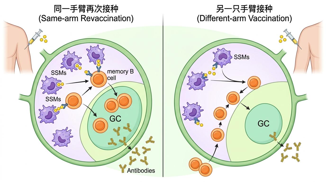 当同一手臂再次接种疫苗时,预先激活的SSMs能更快地把抗原呈递给附近的记忆B细胞,直接推动它们进入生发中心。而如果换了另一只手臂,新的引流淋巴结里的SSMs还没「热身」,记忆B细胞只能靠全身循环过来,反应自然慢半拍。
