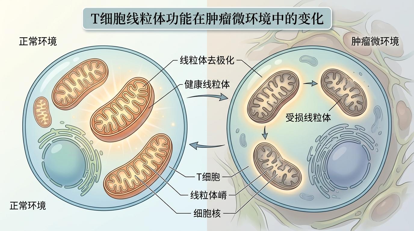 你可以把T细胞想象成一台时刻待命的战斗机,线粒体就是它的发动机。当T细胞钻进肿瘤微环境这个充满毒素和缺氧的“烂泥塘”,发动机很快就会故障——专业说法叫线粒体去极化。过去我们以为,T细胞耗竭只是“油烧完了”,但这次的发现完全推翻了这个假设。