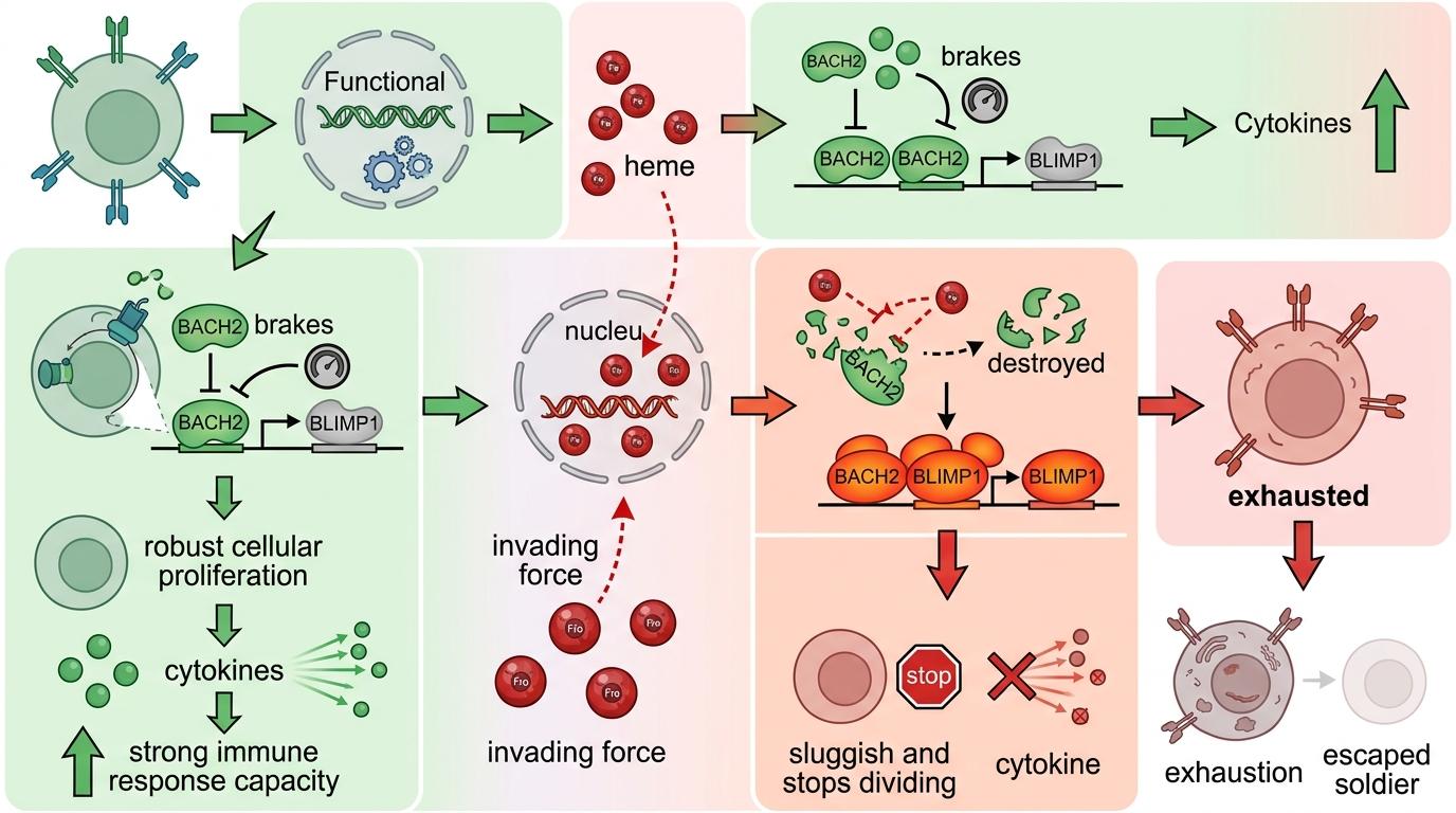 这些血红素不是废物,而是伪装成信使的内奸。它们溜进细胞核,精准找到维持T细胞“战斗力”的关键转录因子BACH2,把它彻底破坏。而BACH2原本是另一个转录因子BLIMP1的“刹车”,刹车失灵后,BLIMP1开始疯狂工作,直接把T细胞推进了“终末耗竭”的死胡同——它们不再增殖,不再产生杀敌的细胞因子,彻底变成了战场上的逃兵。