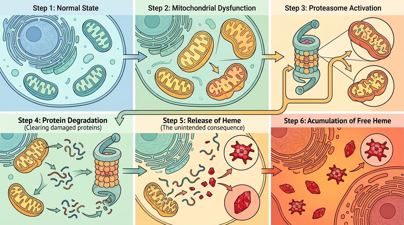 研究人员在显微镜下看到了完整的“叛变链条”:线粒体故障后,细胞会启动蛋白酶体这个“垃圾处理站”,分解受损的线粒体蛋白。这本是细胞的自救机制,没想到却捅了娄子——清理过程中,含血红素的蛋白质被拆碎,释放出大量游离的调节性血红素。