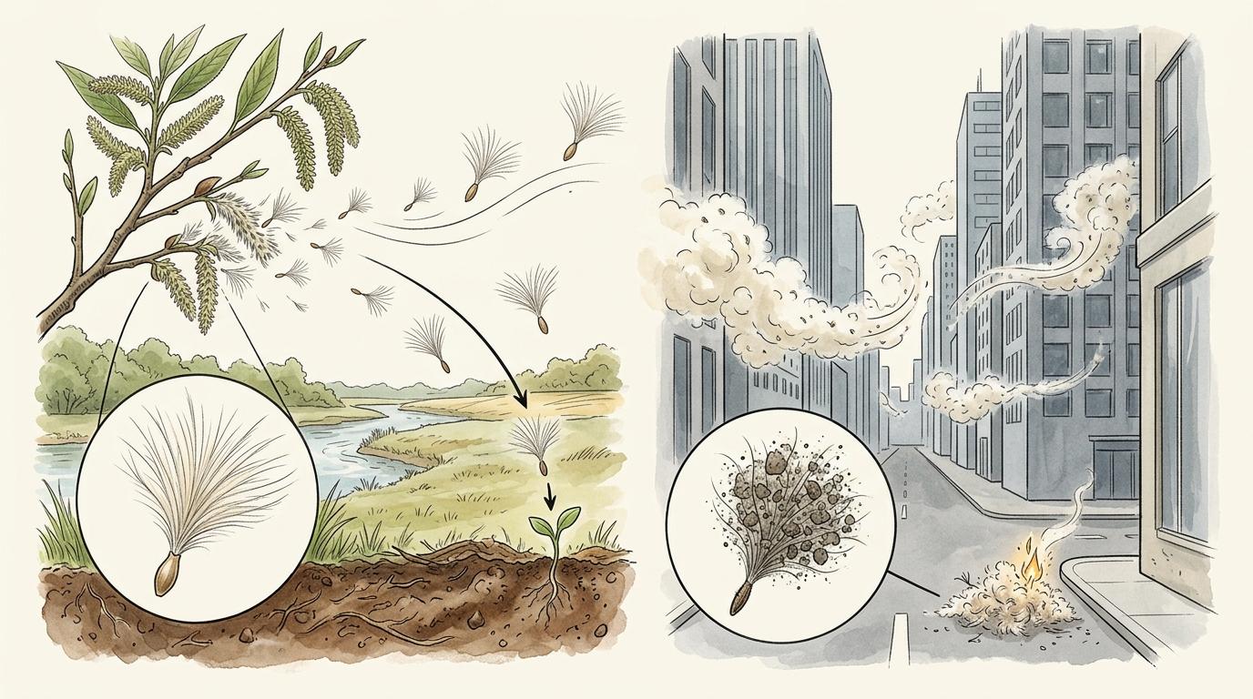 1977年,北京被联合国列为“世界沙漠化边缘城市”,年均沙尘暴天数超过20天。要挡住风沙,最划算的选择就是杨柳树——它们耐贫瘠、耐干旱,裸根就能栽活,一棵胸径五六厘米的树苗只要二三十块钱,三五年就能长成遮天大树。更关键的是,雌株比雄株长得快、长得粗,按胸径算钱的苗圃里,种雌株的收益比雄株高30%。 没人在意雌雄的区别,直到五六年过去,第一批雌株开始结絮。等人们反应过来时,北京已经种下了200万株杨柳雌株,近一成的行道树都是它们。每年春天,当气温跨过25℃的阈值,这些完成了防风固沙使命的树,就会用漫天飞絮宣告自己的繁殖本能。 这不是树的错。在自然环境里,飞絮是杨柳传播种子的唯一方式——每粒种子带着绒毛,能飘到几公里外的湿润土壤里生根。但在钢筋水泥的城市里,飞絮找不到落脚的泥土,只能在街道峡谷里反复打转,和灰尘、微生物缠在一起,成为过敏人群的噩梦,甚至2秒钟就能引燃一片火灾。