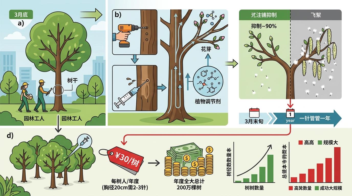 给雌树打针是最先想到的办法。每年3月底,园林工人会在树干上钻洞,注射能抑制花芽的植物调节剂——一针管能管一年,抑制90%的飞絮,但一棵胸径20厘米的树要打两三针,加上人工成本,每棵树每年要花30块。200万棵树,就是6000万。